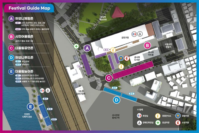 축제장소는 크게 세 곳으로 금천구청역 앞 광장 삼거리와 금천구청 청사 앞 광장, 안양천 다목적광장입니다.