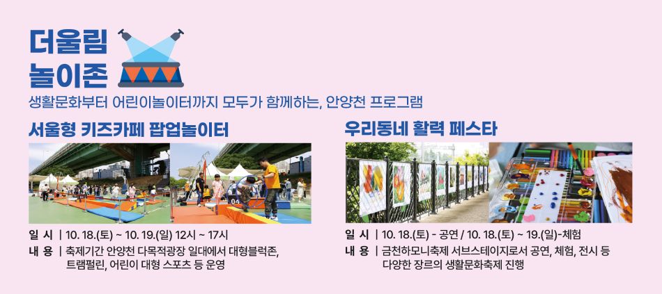 안양천 다목적광장에서는 서울형 키즈카페 팝업놀이터부터 금천구 생활문화축제가 진행됩니다.